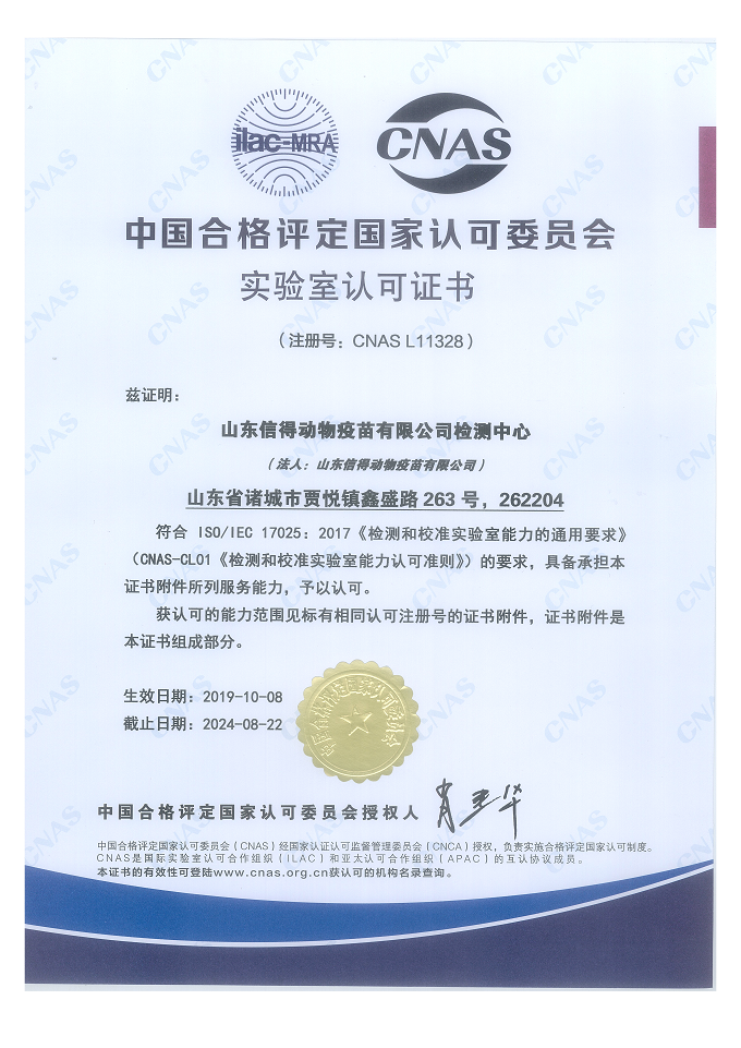 山东德赢VWIN动物疫苗有限公司CNAS平台获得国家认证,并通过农业部GCP认证;